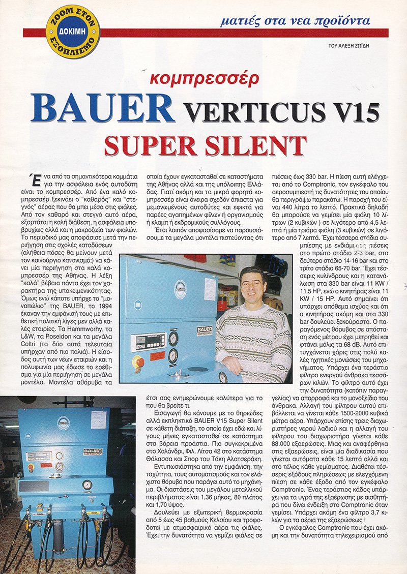 Το 1994 λοιπόν η δουλειά άνοιξε και είχα συνεχώς πολλές φιάλες για γέμισμα. Έτσι αποφάσισα να πάρω ένα μεγάλο κομπρεσσέρ. Έκανα έρευνα αγοράς και ήμουν ανάμεσα στο Bauer, σε ένα μεγάλο Coltri και σε ένα κομπρεσσέρ της Hammworthy. Τη Bauer όμως την ήξερα, την εμπιστευόμουν και ήμουν ευχαριστημένος από τα δύο προηγούμενα που είχα, όσον αφορά την αξιοπιστία. Έτσι τον Ιούνιο του 1994 προχώρησα στην αγορά του Bauer Verticus V15 Super Silent που έχω ακόμα, το οποίο είναι θηρίο, γεμίζει 29 κυβικά μέτρα την ώρα και δεν υπήρχε άλλο τέτοιο κομπρεσσέρ στην Ελλάδα. Ήμουν ο πρώτος δηλαδή που έφερα τόσο μεγάλο κομπρεσσέρ της Bauer στην Ελλάδα και φαντάσου ότι ήρθαν ο μάνατζερ πωλήσεων, ονόματι Λουφερσέντερ καθώς και ο μηχανικός της εταιρίας, ο Μάχερ, για να ελέγξουν αν έγινε σωστή τοποθέτηση. Μου έκαναν δώρο και το δοχείο υγρών. Τον Ιανουάριο του 1995 ακολούθησε και η παρουσίαση στο ελληνικό περιοδικό βυθός. Έστειλα στη Bauer στη Γερμανία το περιοδικό με το αφιέρωμα που μου ετοίμασε ο Αλέξανδρος Ζωΐδης και για να με ευχαριστήσουν για τη διαφήμιση μου έστειλαν ένα έξτρα φίλτρο. Είχα τακτική αλληλογραφία μαζί τους. Μετά πήρε την αντιπροσωπεία ο Ηλιάδης.